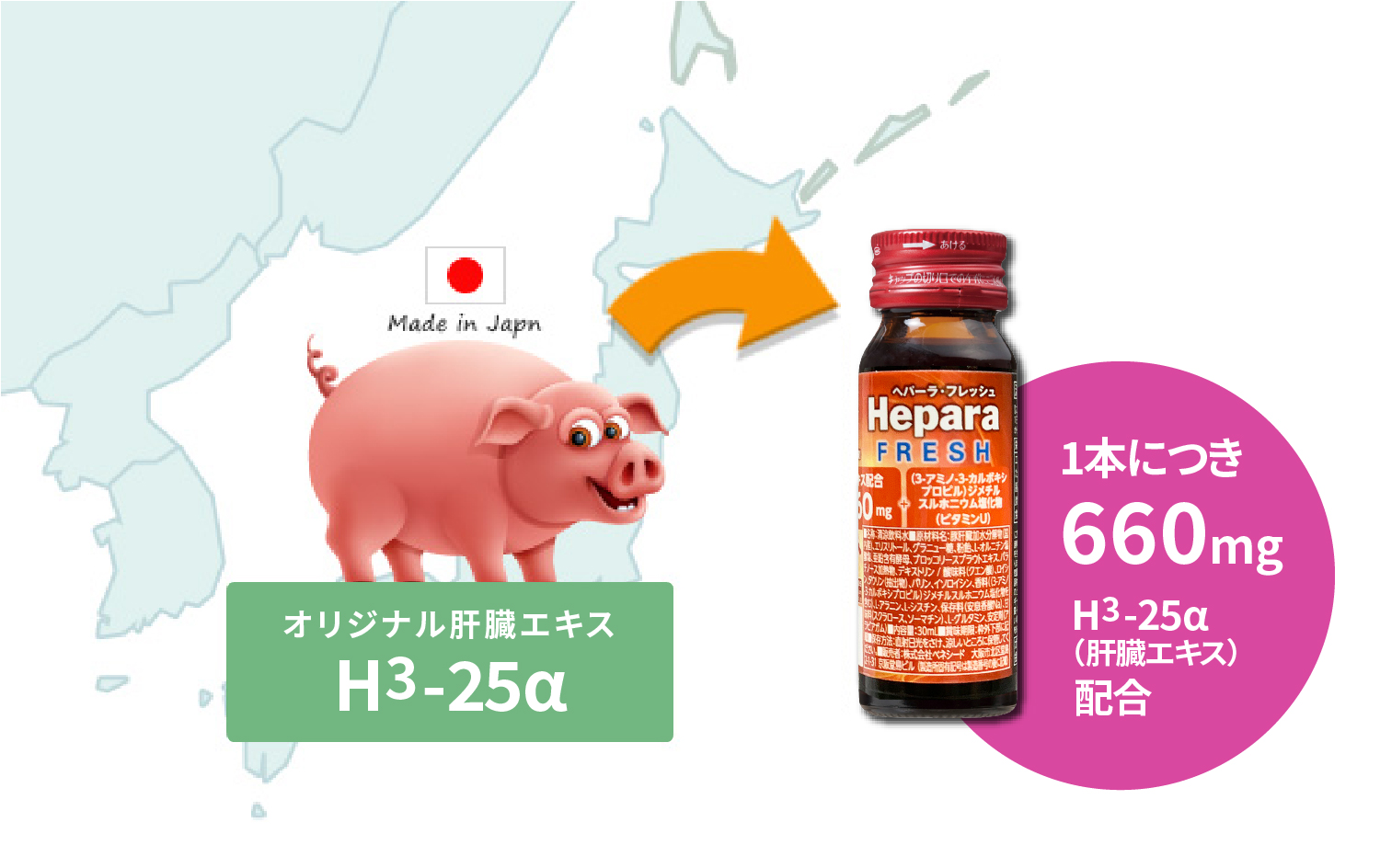 ベネシード社は、日本の医薬品製造メーカーとの共同開発により、この「肝臓エキス」にアラニン・グルタミンなどをさらに強化しました。 原料となるレバーは、国内で飼育された健康な豚のみを使用し、製造から出荷まで全て国内で行なっています。ベネシード社は、この「オリジナル肝臓エキス」を「H³-25α(エイチキューブ25アルファ)」と名付け、1本につき660mg配合しています。